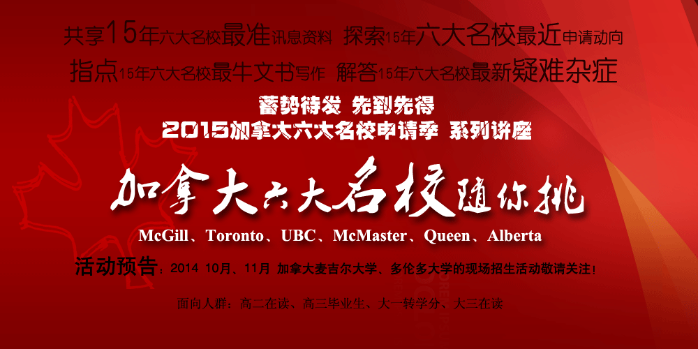 2014年3月30日下午14:00,“加拿大六大名校随你挑”特别邀请了麦吉尔大学(加拿大排名第1&世界排名第18)招生官Melanie Element现身上海,探讨2015年加拿大顶尖名校的申请及签证政策讲座。同时,上师出国美加英中心首席顾问、中美加教育交流会主席JENNY ZHOU也为家长和子女深度剖析2015年加拿大顶尖名校的申请技巧及加拿大最新签证政策。活动当天,人潮涌动,学生和家长“满载而归”,活动于下午五点圆满落幕。随之而来的是加拿大名校申请系列后续讲座之专业篇、就业篇及移民篇将于4.12、4.26、5.10分别在上师出国美加英中心陆续推出,欢迎学生家长预约参与讲座活动。